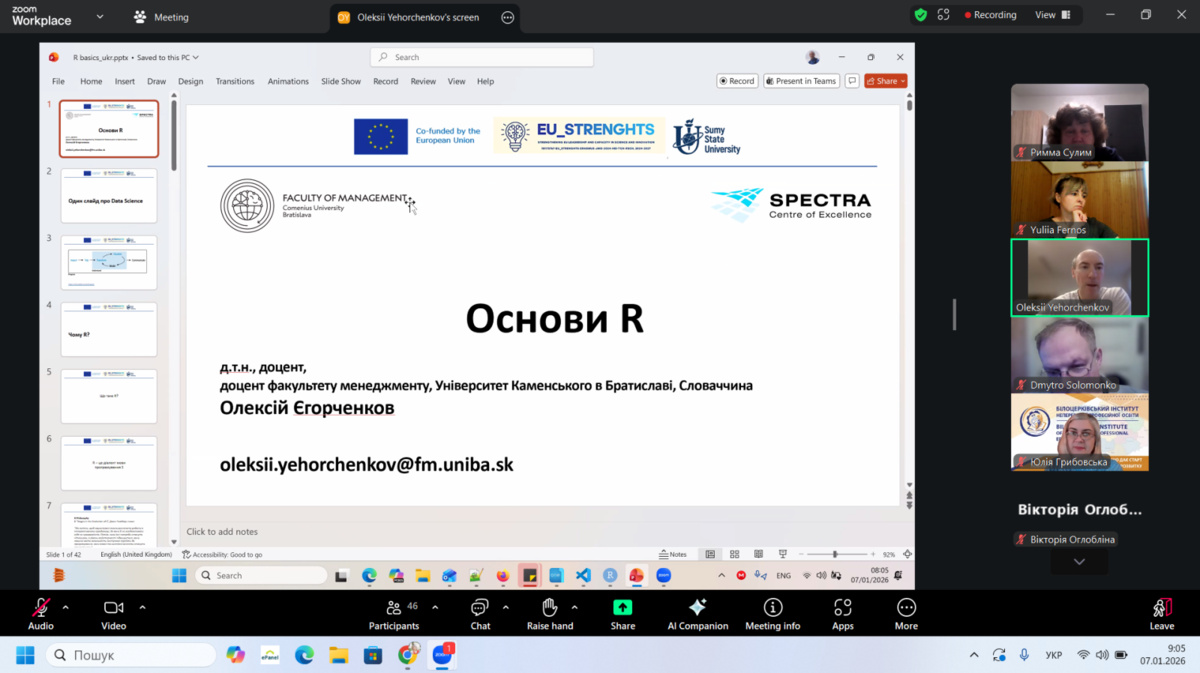Особливий професійний інтерес для Юлії Фернос як філолога становила лекція з академічного письма та вимог до оформлення наукових статей відповідно до європейських стандартів, яку прочитав Олександр Кубатко, доктор економічних наук, професор, завідувач кафедри економіки, підприємництва та бізнес-адміністрування Сумського державного університету. У межах лекції було детально розглянуто структуру наукової публікації, принципи логічної організації тексту, вимоги до академічної доброчесності, коректної роботи з науковими джерелами, а також особливості підготовки статей до подання в міжнародні рецензовані видання. Цінними стали й практичні рекомендації лектора, який є редактором наукового журналу, що індексується у базі Scopus, і має значний досвід у сфері академічного письма та публікаційної діяльності.