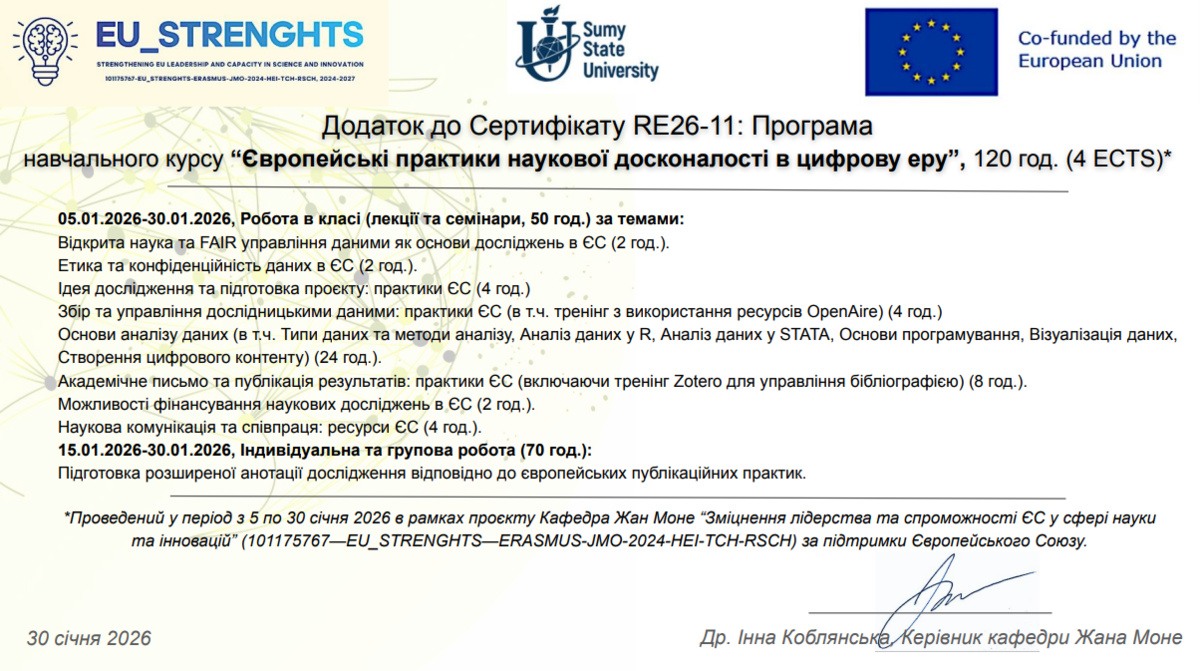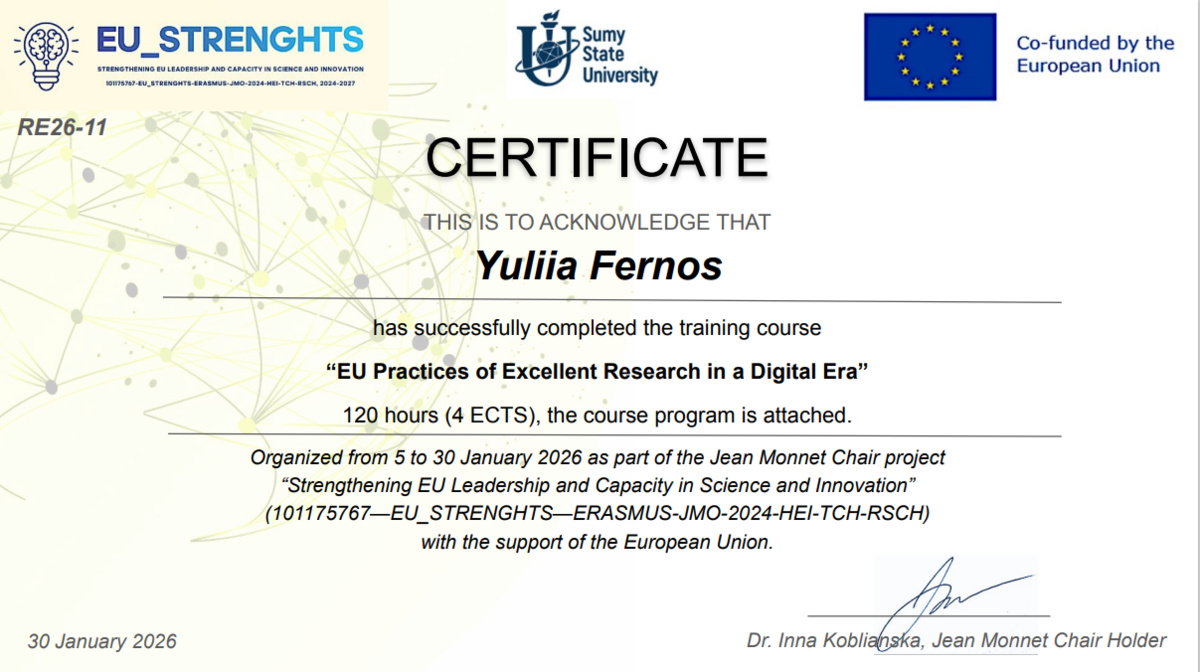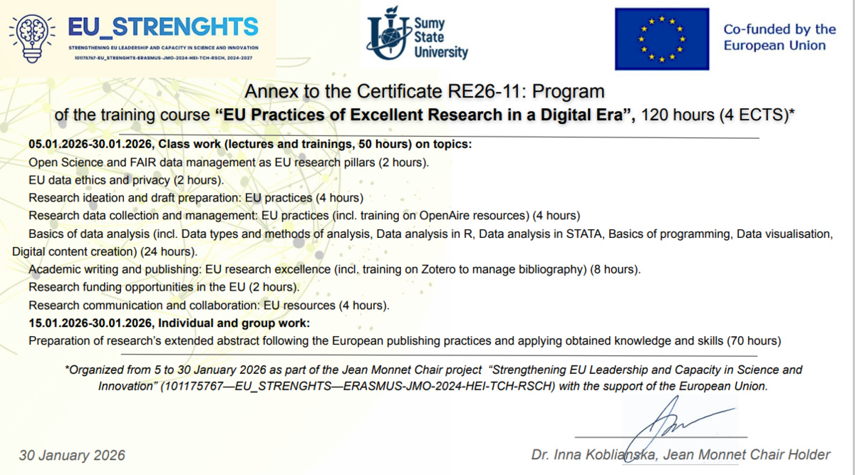 Курс «Європейські практики наукової досконалості в цифрову еру», 13.01–07.02.2025 (4 ECTS) організований у рамках виконання проєкту Кафедра Жана Моне «Зміцнення лідерства та спроможності ЄС у сфері науки та інновацій»
