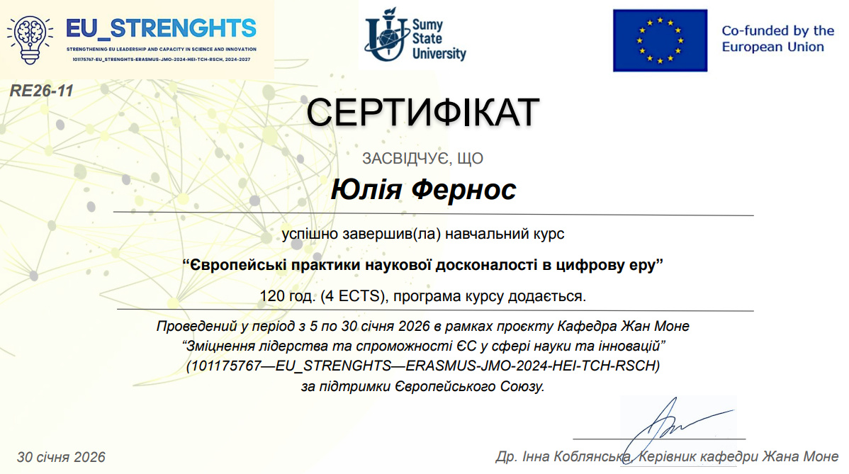 Доцент кафедри української та іноземних мов Уманського національного університету Юлія Фернос взяла участь у міжнародному навчальному курсі «Європейські практики наукової досконалості в цифрову еру», спрямованому на підвищення якості науково-дослідної діяльності та інтеграцію європейських стандартів у сучасну академічну практику.