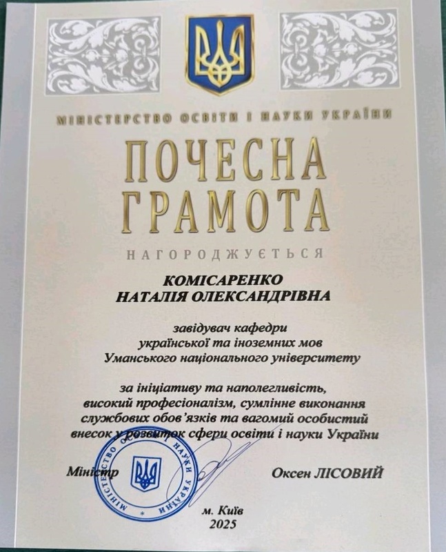 Вітаємо Наталію Олександрівну Комісаренко з Почесною грамотою МОН України!